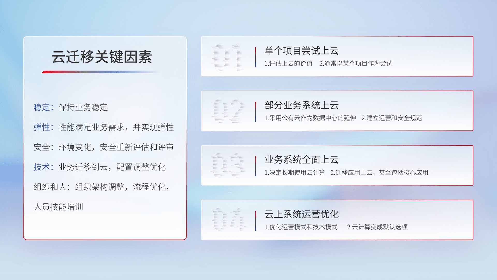 结合实际业务,,,从规划设计、、、云平台选型、、、云原生改造、、、、数据迁移、、、集成交付,,迁移全过程为客户识别最佳上云路径,,,,做好风险识别管理,,,设计网络架构、、、、身份权限、、、、安全审计合规、、操作审计、、日志审计、、、监控告警策略、、多站点容灾设计等,,,,对云上基础设施进行整体规划,,,,提升IT治理水平,,以满足弹性、、高可用、、、高性能的需求。。。。