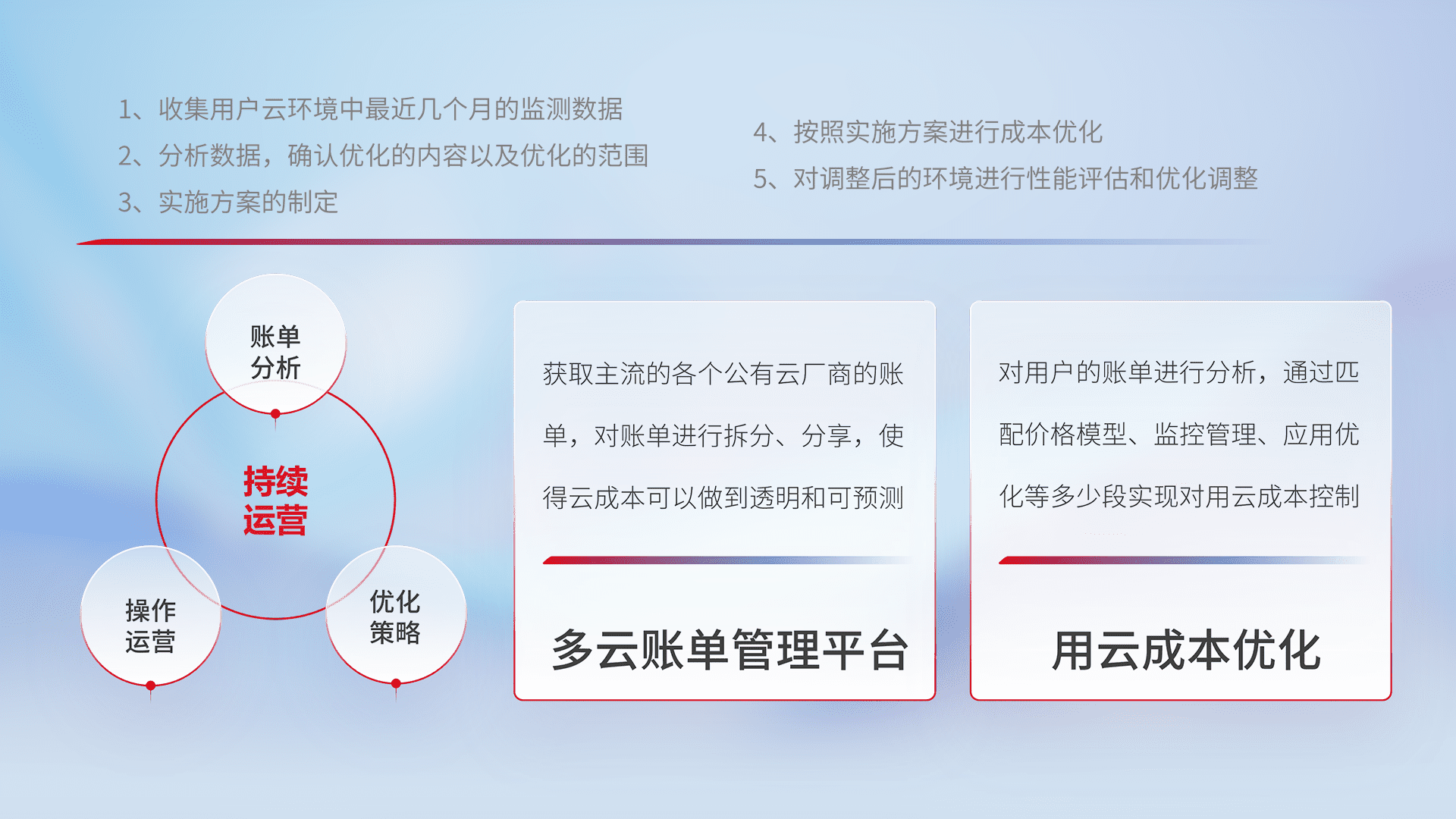 通过多云纳管,,以统一的资源数据模型把客户的云资源进行抽象和封装,,,,进而实现对多云资源的统一操作,,,,保障云资源管理的可靠性、、、、稳定性与可用性。。。。量身定制化运维内容,,,配置、、、开发运维、、补丁管理、、、、备份、、、、监控、、认证和访问管理、、、、审计和日常巡检等,,,保障在用云过程中的可靠度,,,稳定度以及高可用率。。。